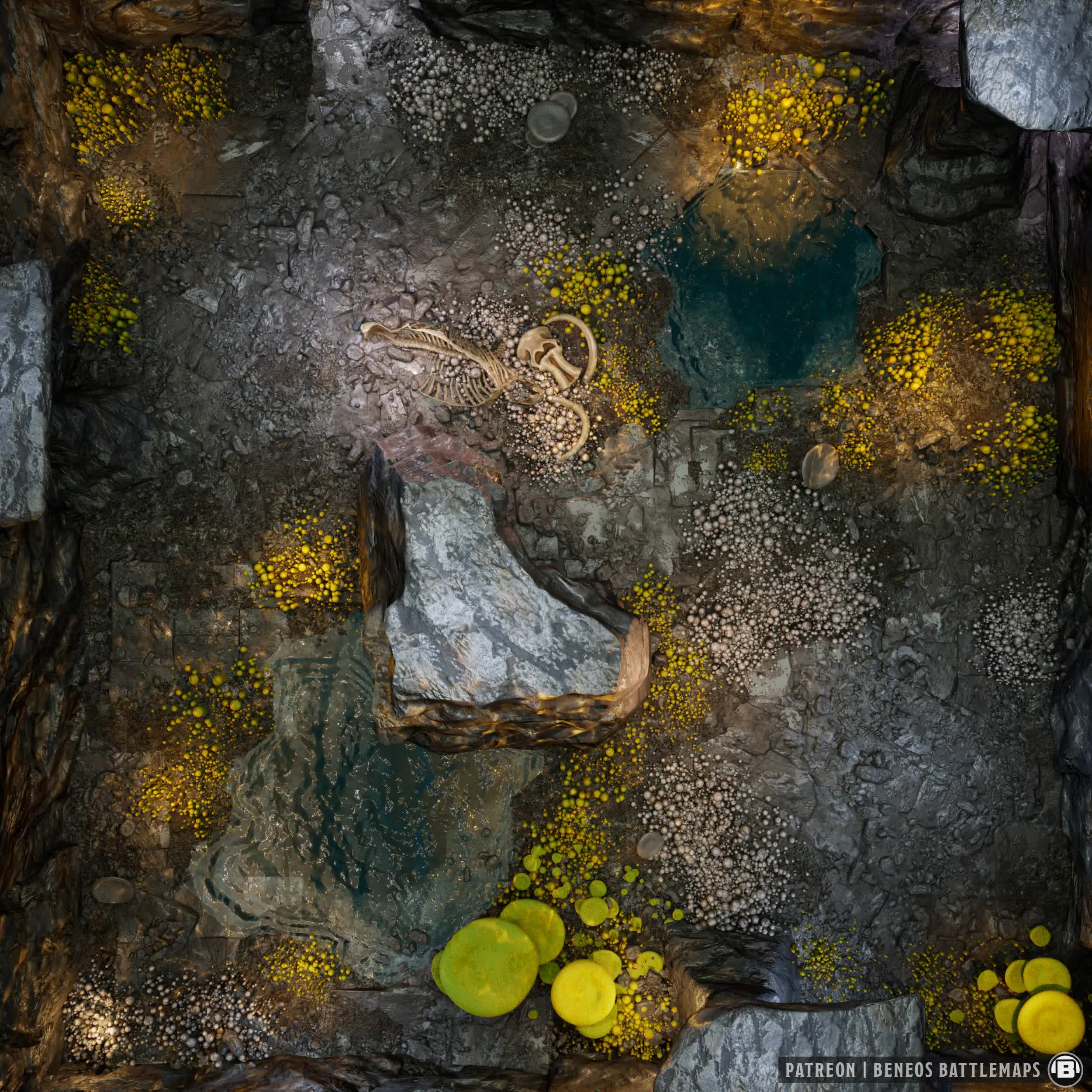 This map set works beautifully with a range of Beneos Tokens - Ghoul Bone-Gnawers, Wretchlings or Garghouls might emerge from the looming chasms, the fungal forests are perfect hunting grounds for Gloomspore Harvesters or Spore Shepherds, while the island and surrounding waters may teem with Gargling Headtakers, Moray Drake or house a Klabautermann